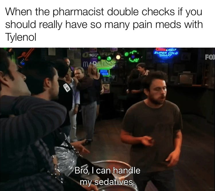 I had to space them out carefully because they all had Tylenol. They maxed out my liver’s ability to process acetaminophen/paracetamol. Death by painkiller overdose can be a result of too much Tylenol.